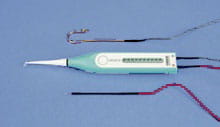 Elektroniczne urządzenie do pomiaru grubości zębiny podczas opracowania zęba pod koronę protetyczną.